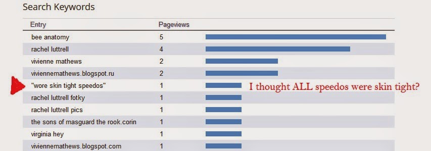 A rational author might concern themselves more with the fact that as many people stopped by to gaze upon the glorious Virginia Hey as were interested in the next release of the Sons of Masguard, but (being decidedly UN-rational, which is too a word) I was too distracted by the thought that someone came here looking for a person* in skin tight speedos and walked away disappointed.